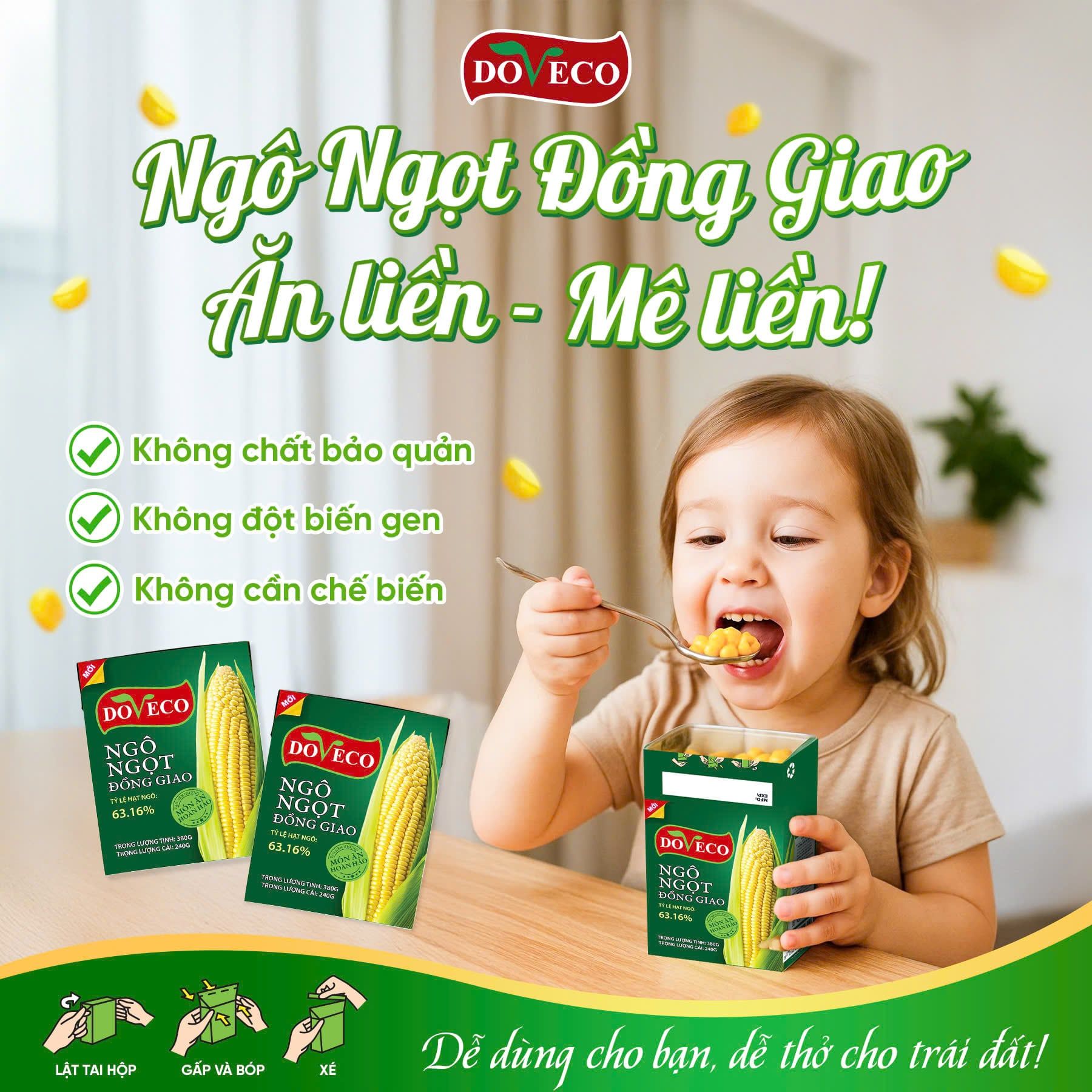 Doveco là một trong những doanh nghiệp hàng đầu Việt Nam trong lĩnh vực chế biến nông sản, đặc biệt là các sản phẩm đóng hộp và đông lạnh. Sản phẩm ngô ngọt đóng hộp Doveco được sản xuất từ những hạt ngô ngọt tươi ngon, chọn lọc kỹ càng, đảm bảo giữ được hương vị tự nhiên và giá trị dinh dưỡng.